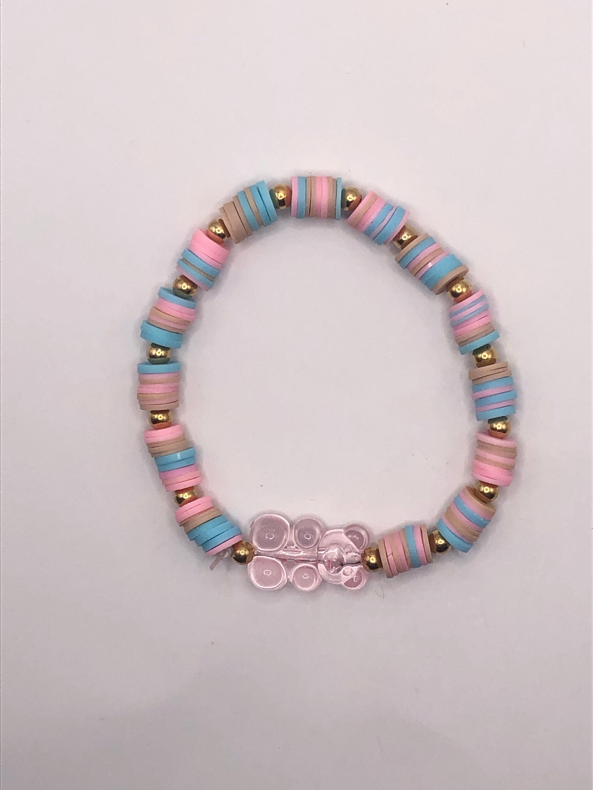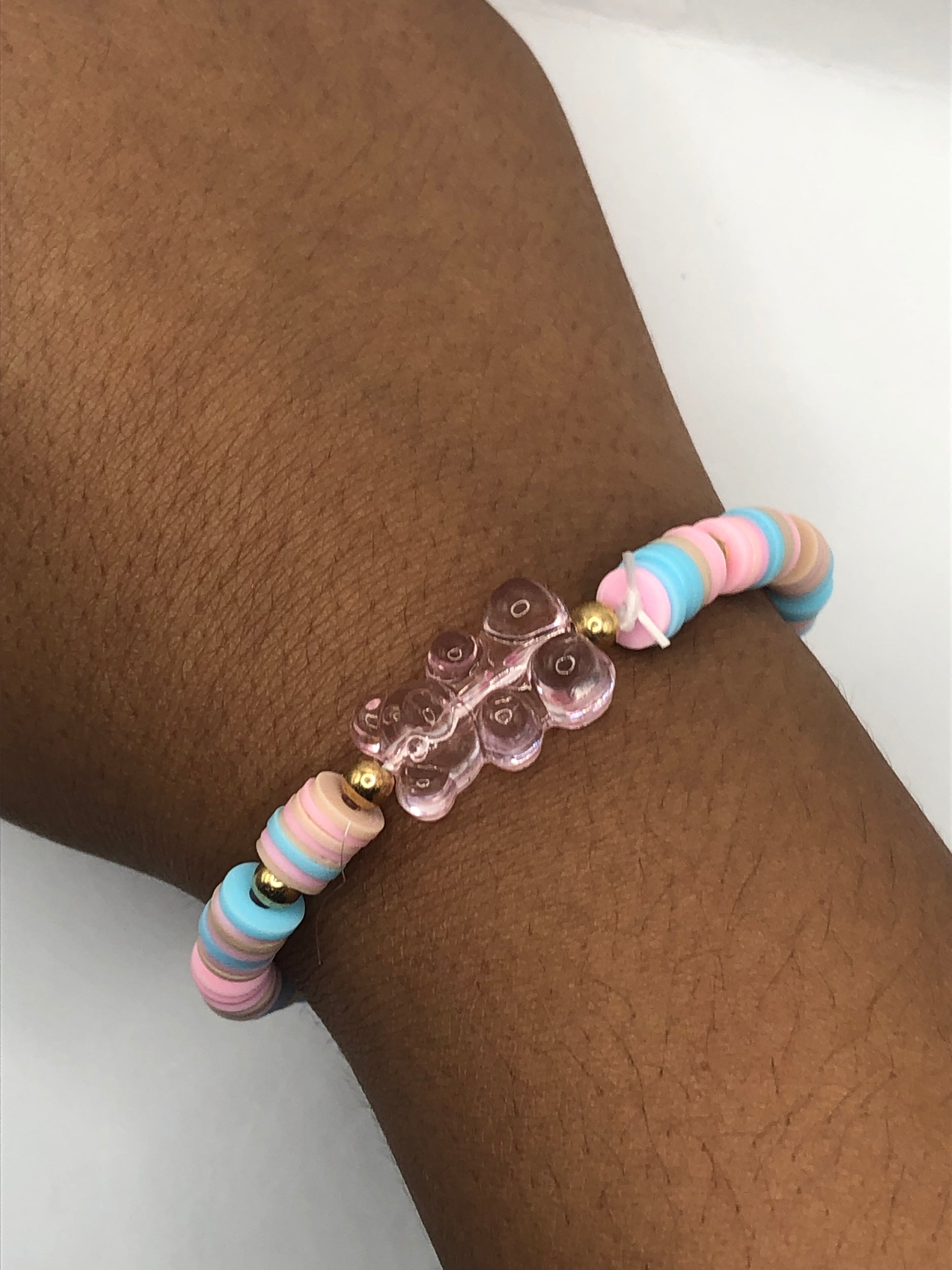 This bracelet is designed to look like a gummy bear beach vibe. The colors are pink, blue, brown, with golden circle charms, and a pink gummy bear charm. This bracelet is very stretchy and sturdy.
