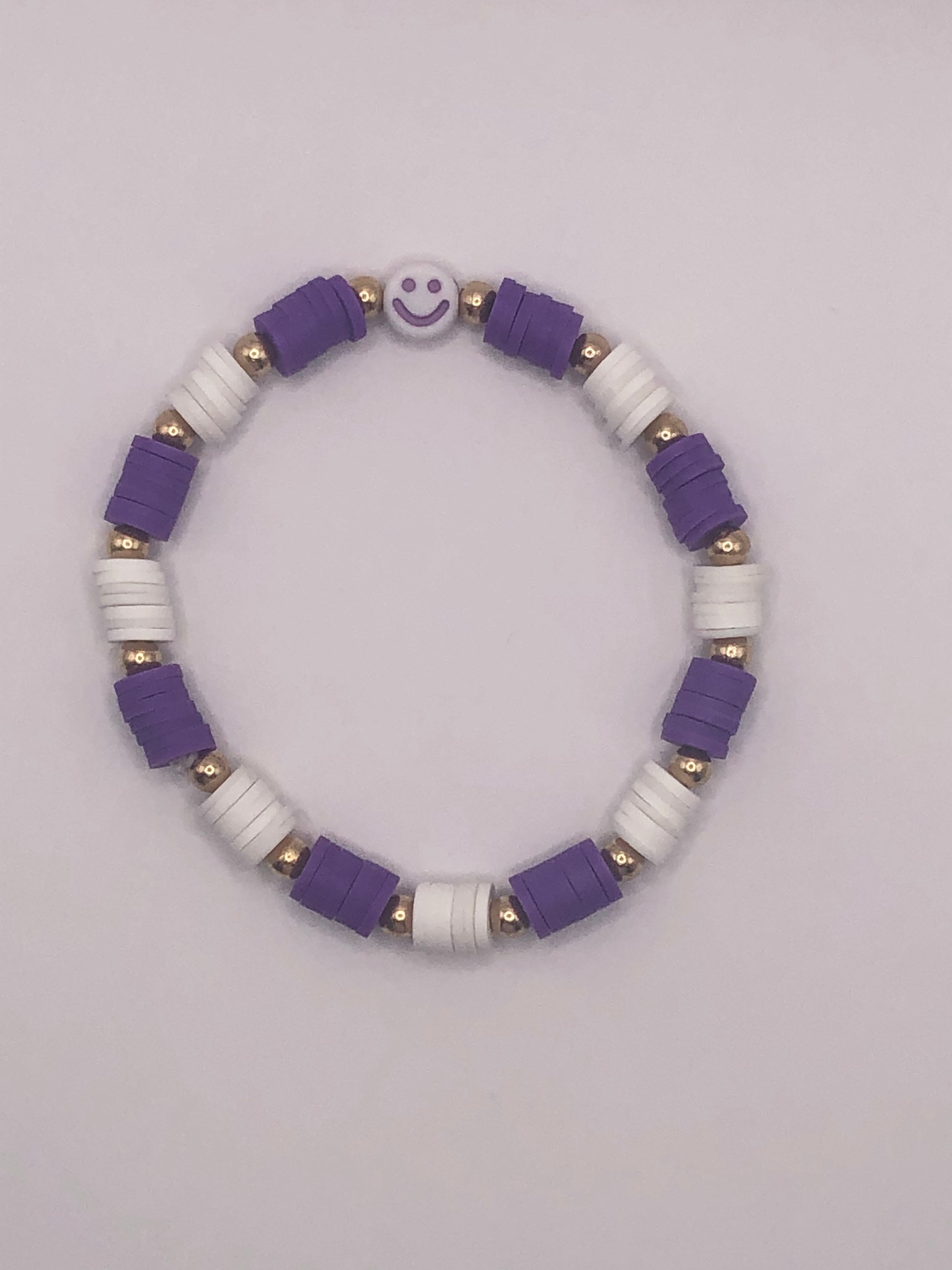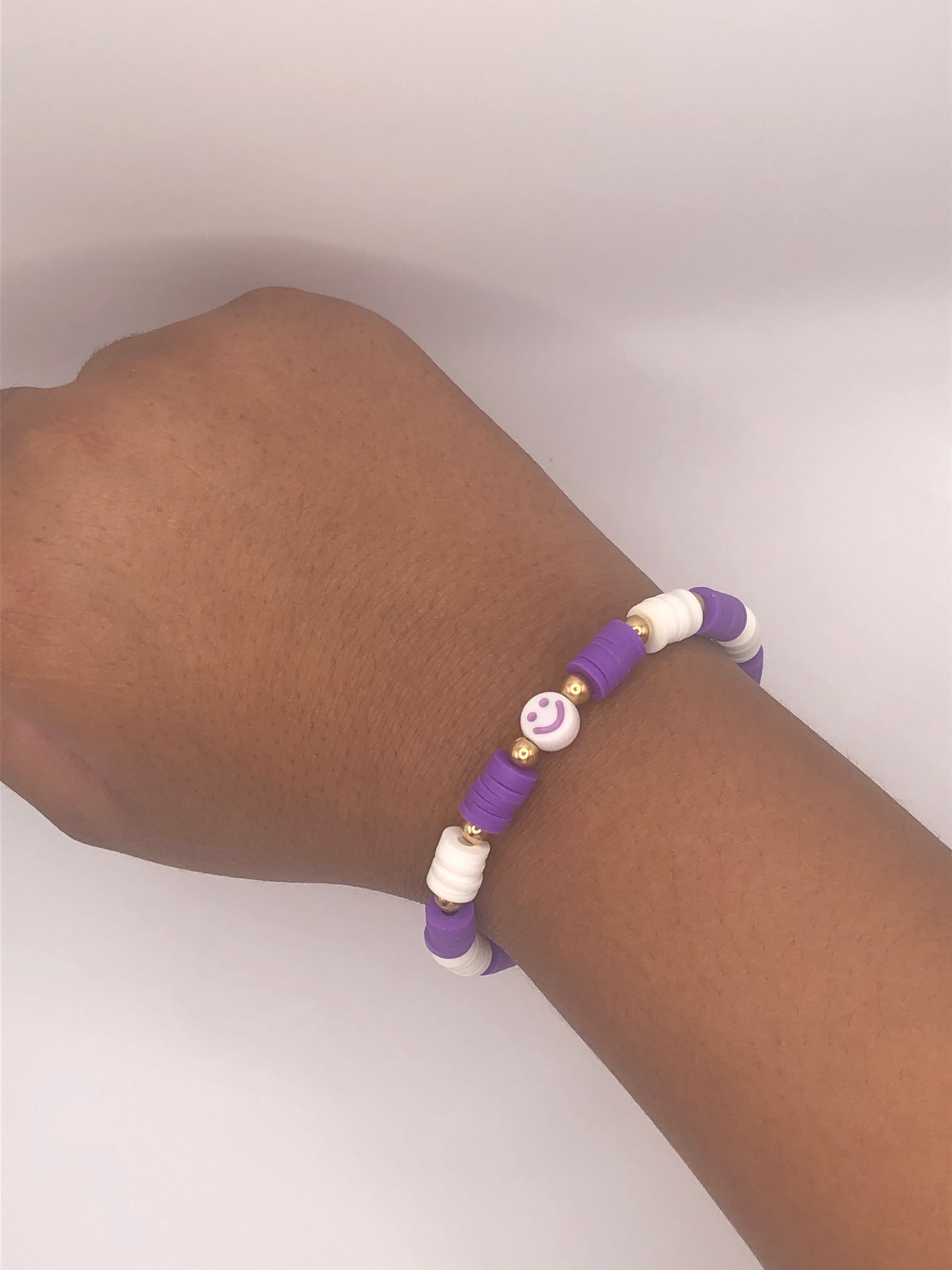 This bracelet is designed to look like a special royal purple. The colors are purple, white, it has some golden charms, and a purple smiley face charm. This bracelet is very stretchy and sturdy.